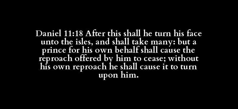 Daniel 11:18 After this shall he turn his face unto the isles, and shall take many: but a prince for his own behalf shall cause the reproach offered by him to cease; without his own reproach he shall cause it to turn upon him.
