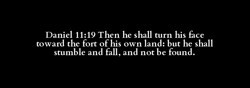 Daniel 11:19 Then he shall turn his face toward the fort of his own land: but he shall stumble and fall, and not be found.