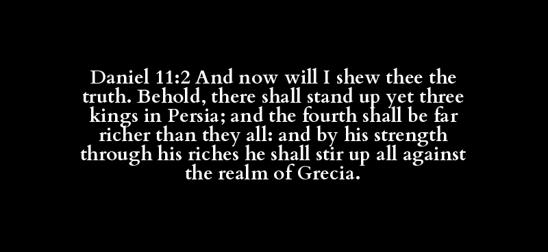 Daniel 11:2 And now will I shew thee the truth. Behold, there shall stand up yet three kings in Persia; and the fourth shall be far richer than they all: and by his strength through his riches he shall stir up all against the realm of Grecia.