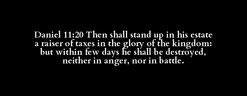 Daniel 11:20 Then shall stand up in his estate a raiser of taxes in the glory of the kingdom: but within few days he shall be destroyed, neither in anger, nor in battle.