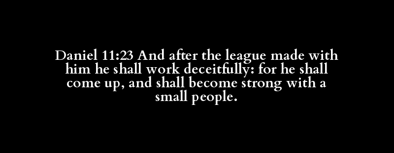 Daniel 11:23 And after the league made with him he shall work deceitfully: for he shall come up, and shall become strong with a small people.