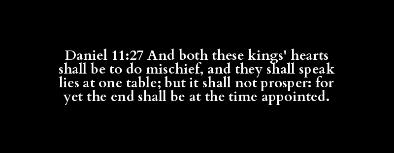 Daniel 11:27 And both these kings' hearts shall be to do mischief, and they shall speak lies at one table; but it shall not prosper: for yet the end shall be at the time appointed.