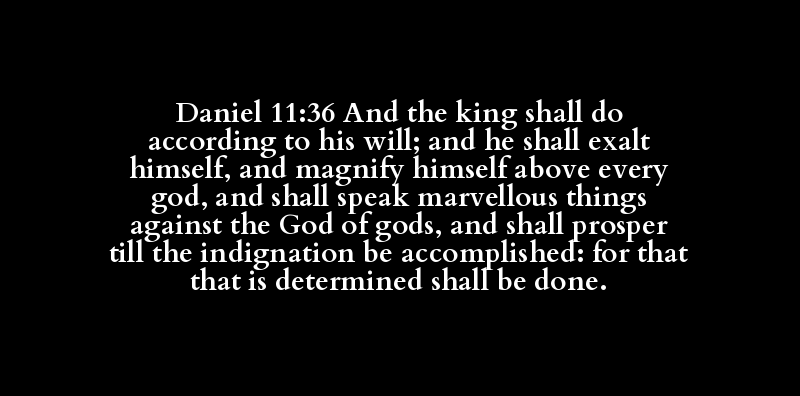 Daniel 11:36 And the king shall do according to his will; and he shall exalt himself, and magnify himself above every god, and shall speak marvellous things against the God of gods, and shall prosper till the indignation be accomplished: for that that is determined shall be done.