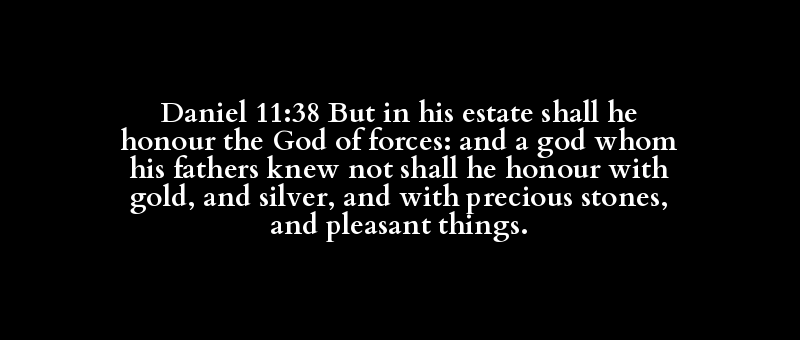Daniel 11:38 But in his estate shall he honour the God of forces: and a god whom his fathers knew not shall he honour with gold, and silver, and with precious stones, and pleasant things.