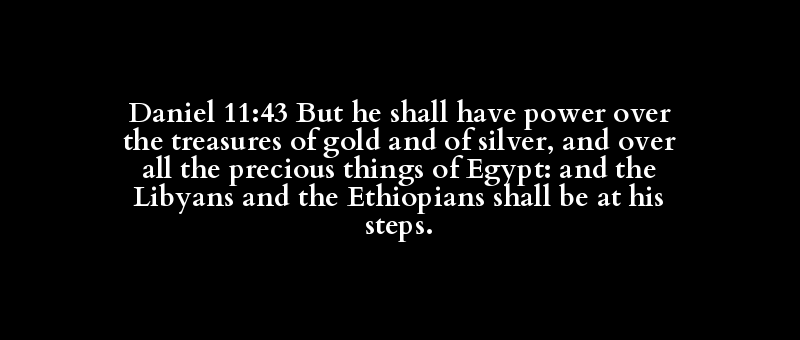 Daniel 11:43 But he shall have power over the treasures of gold and of silver, and over all the precious things of Egypt: and the Libyans and the Ethiopians shall be at his steps.