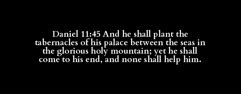 Daniel 11:45 And he shall plant the tabernacles of his palace between the seas in the glorious holy mountain; yet he shall come to his end, and none shall help him.