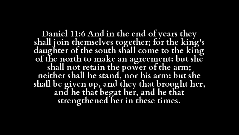 Daniel 11:6 And in the end of years they shall join themselves together; for the king's daughter of the south shall come to the king of the north to make an agreement: but she shall not retain the power of the arm; neither shall he stand, nor his arm: but she shall be given up, and they that brought her, and he that begat her, and he that strengthened her in these times.