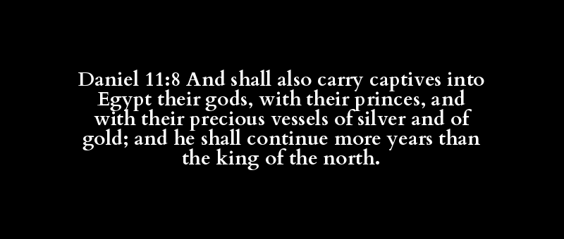 Daniel 11:8 And shall also carry captives into Egypt their gods, with their princes, and with their precious vessels of silver and of gold; and he shall continue more years than the king of the north.