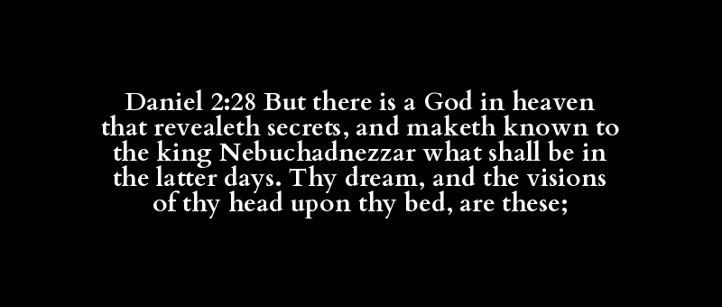 Daniel 2:28 But there is a God in heaven that revealeth secrets, and maketh known to the king Nebuchadnezzar what shall be in the latter days. Thy dream, and the visions of thy head upon thy bed, are these;