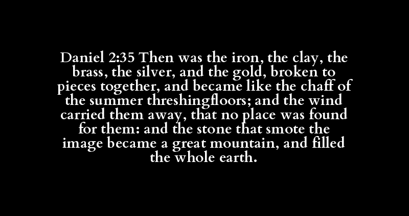 Daniel 2:35 Then was the iron, the clay, the brass, the silver, and the gold, broken to pieces together, and became like the chaff of the summer threshingfloors; and the wind carried them away, that no place was found for them: and the stone that smote the image became a great mountain, and filled the whole earth.