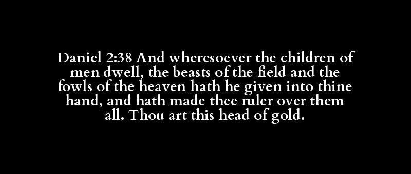 Daniel 2:38 And wheresoever the children of men dwell, the beasts of the field and the fowls of the heaven hath he given into thine hand, and hath made thee ruler over them all. Thou art this head of gold.