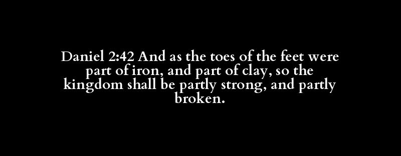 Daniel 2:42 And as the toes of the feet were part of iron, and part of clay, so the kingdom shall be partly strong, and partly broken.