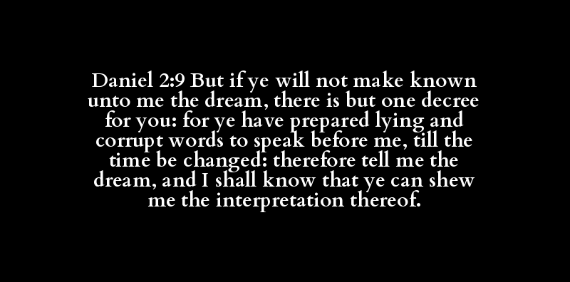 | (that) if, or, whether | or even, neither, no(-ne, -r), (can-)n.. | certify, know, make known, teach | dream | a, first, one, together | × are, it, this | decree, law | prepare | lying | corrupt, fault | commandment, matter, thing, word | command, declare, say, speak, tell | before, × from, × I (thought), × me, +.. | × and, at, for, (hither-)to, on till, .. | time | alter, change, (be) diverse | but, except, save, therefore, wherefore | command, declare, say, speak, tell | dream | certify, know, make known, teach | × as, but, for(-asmuch +), + now, of, .. | shew | interpretation |