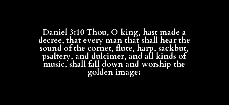Daniel 3:10 Thou, O king, hast made a decree, that every man that shall hear the sound of the cornet, flute, harp, sackbut, psaltery, and dulcimer, and all kinds of music, shall fall down and worship the golden image: