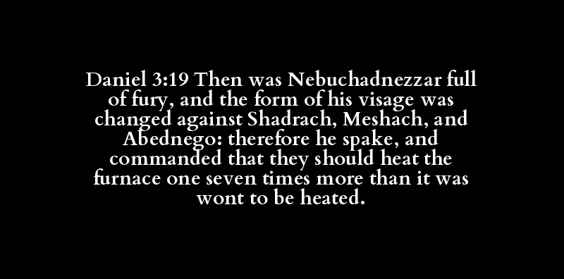 Daniel 3:19 Then was Nebuchadnezzar full of fury, and the form of his visage was changed against Shadrach, Meshach, and Abednego: therefore he spake, and commanded that they should heat the furnace one seven times more than it was wont to be heated.