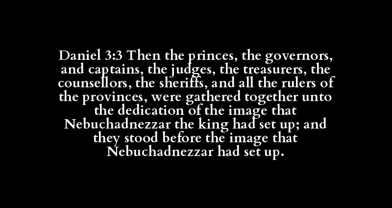Daniel 3:3 Then the princes, the governors, and captains, the judges, the treasurers, the counsellors, the sheriffs, and all the rulers of the provinces, were gathered together unto the dedication of the image that Nebuchadnezzar the king had set up; and they stood before the image that Nebuchadnezzar had set up.