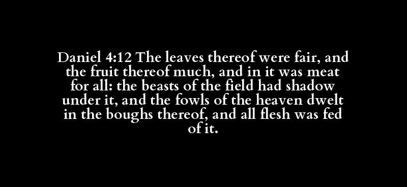 Daniel 4:12 The leaves thereof were fair, and the fruit thereof much, and in it was meat for all: the beasts of the field had shadow under it, and the fowls of the heaven dwelt in the boughs thereof, and all flesh was fed of it.