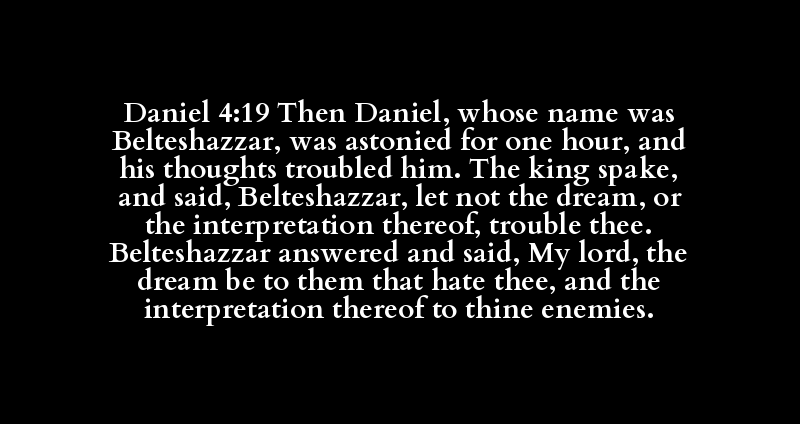 Daniel 4:19 Then Daniel, whose name was Belteshazzar, was astonied for one hour, and his thoughts troubled him. The king spake, and said, Belteshazzar, let not the dream, or the interpretation thereof, trouble thee. Belteshazzar answered and said, My lord, the dream be to them that hate thee, and the interpretation thereof to thine enemies.