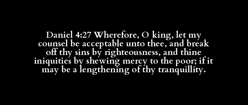 Daniel 4:27 Wherefore, O king, let my counsel be acceptable unto thee, and break off thy sins by righteousness, and thine iniquities by shewing mercy to the poor; if it may be a lengthening of thy tranquillity.
