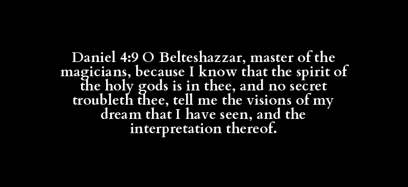 | בֵּלְטְשַׁאצַּר | רַב | חַרְטֹם | אֲנָא | יְדַע | רוּחַ | קַדִּישׁ | אֱלָהּ | לָא | כֹּל | רָז | אֲנַס | אֲמַר | חֵזֵו | חֵלֶם | חֲזָא | פְּשַׁר |