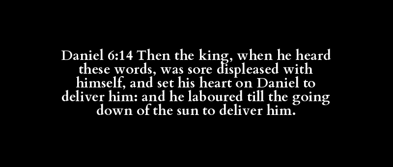Daniel 6:14 Then the king, when he heard these words, was sore displeased with himself, and set his heart on Daniel to deliver him: and he laboured till the going down of the sun to deliver him.