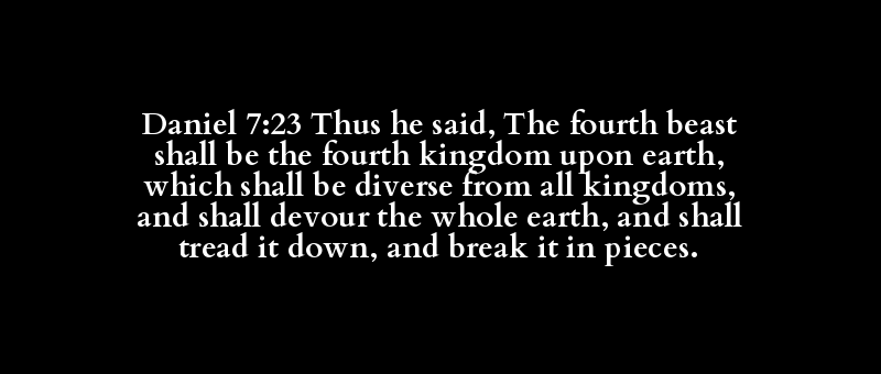 Daniel 7:23 Thus he said, The fourth beast shall be the fourth kingdom upon earth, which shall be diverse from all kingdoms, and shall devour the whole earth, and shall tread it down, and break it in pieces.