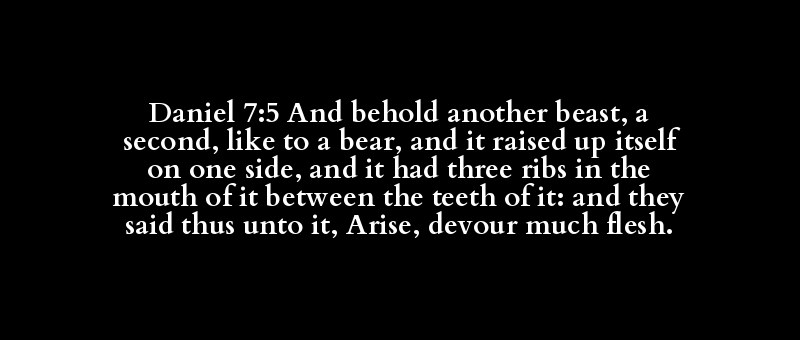 Daniel 7:5 And behold another beast, a second, like to a bear, and it raised up itself on one side, and it had three ribs in the mouth of it between the teeth of it: and they said thus unto it, Arise, devour much flesh.
