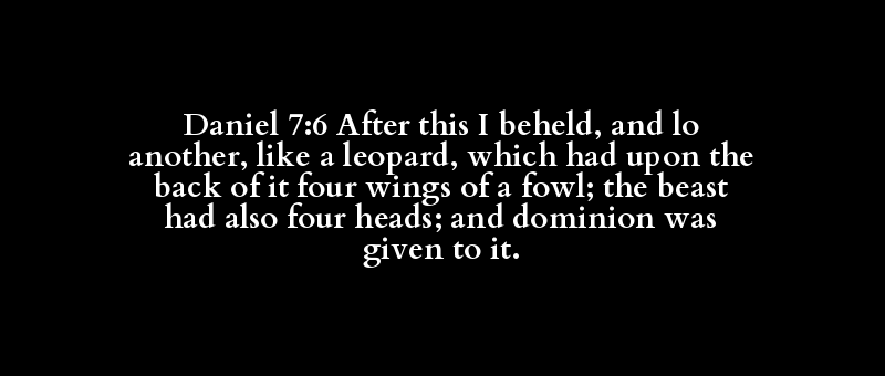 Daniel 7:6 After this I beheld, and lo another, like a leopard, which had upon the back of it four wings of a fowl; the beast had also four heads; and dominion was given to it.