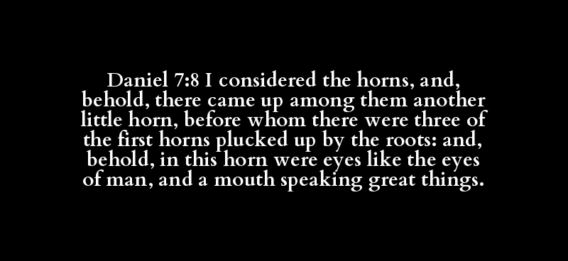 Daniel 7:8 I considered the horns, and, behold, there came up among them another little horn, before whom there were three of the first horns plucked up by the roots: and, behold, in this horn were eyes like the eyes of man, and a mouth speaking great things.