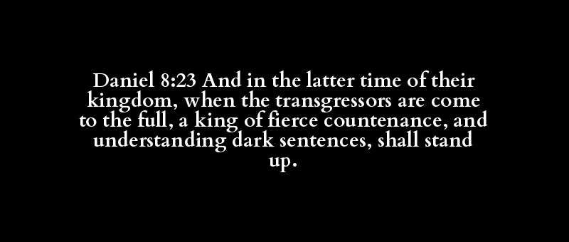 Daniel 8:23 And in the latter time of their kingdom, when the transgressors are come to the full, a king of fierce countenance, and understanding dark sentences, shall stand up.
