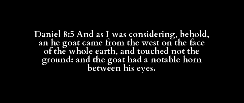 Daniel 8:5 And as I was considering, behold, an he goat came from the west on the face of the whole earth, and touched not the ground: and the goat had a notable horn between his eyes.