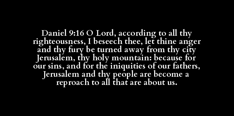 Daniel 9:16 O Lord, according to all thy righteousness, I beseech thee, let thine anger and thy fury be turned away from thy city Jerusalem, thy holy mountain: because for our sins, and for the iniquities of our fathers, Jerusalem and thy people are become a reproach to all that are about us.