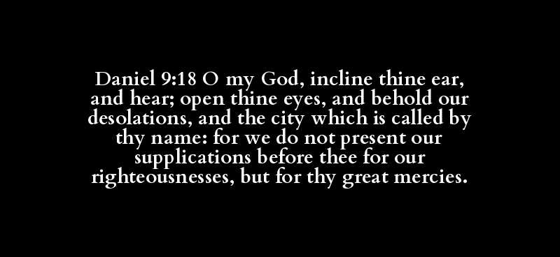 Daniel 9:18 O my God, incline thine ear, and hear; open thine eyes, and behold our desolations, and the city which is called by thy name: for we do not present our supplications before thee for our righteousnesses, but for thy great mercies.