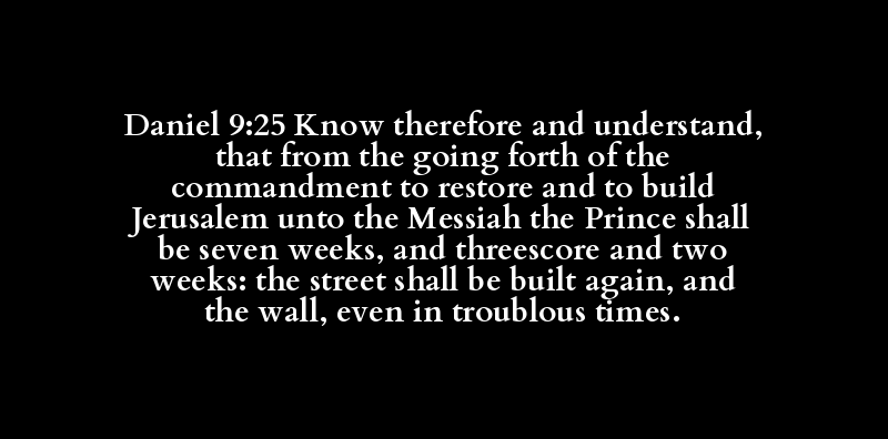 Daniel 9:25 Know therefore and understand, that from the going forth of the commandment to restore and to build Jerusalem unto the Messiah the Prince shall be seven weeks, and threescore and two weeks: the street shall be built again, and the wall, even in troublous times.