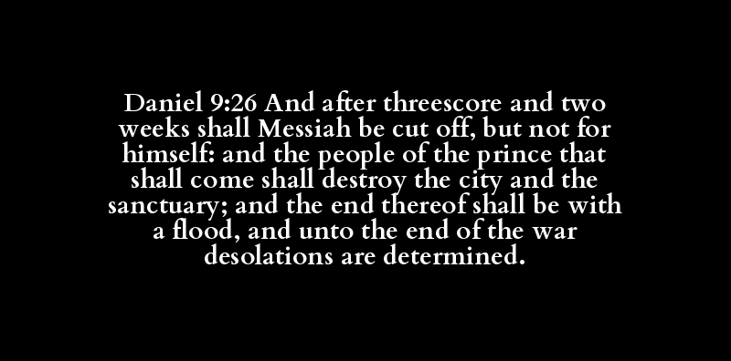 Daniel 9:26 And after threescore and two weeks shall Messiah be cut off, but not for himself: and the people of the prince that shall come shall destroy the city and the sanctuary; and the end thereof shall be with a flood, and unto the end of the war desolations are determined.