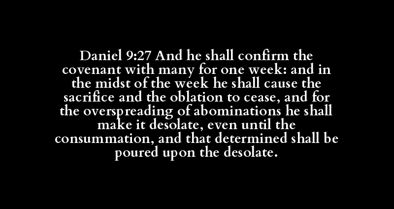 Daniel 9:27 And he shall confirm the covenant with many for one week: and in the midst of the week he shall cause the sacrifice and the oblation to cease, and for the overspreading of abominations he shall make it desolate, even until the consummation, and that determined shall be poured upon the desolate.