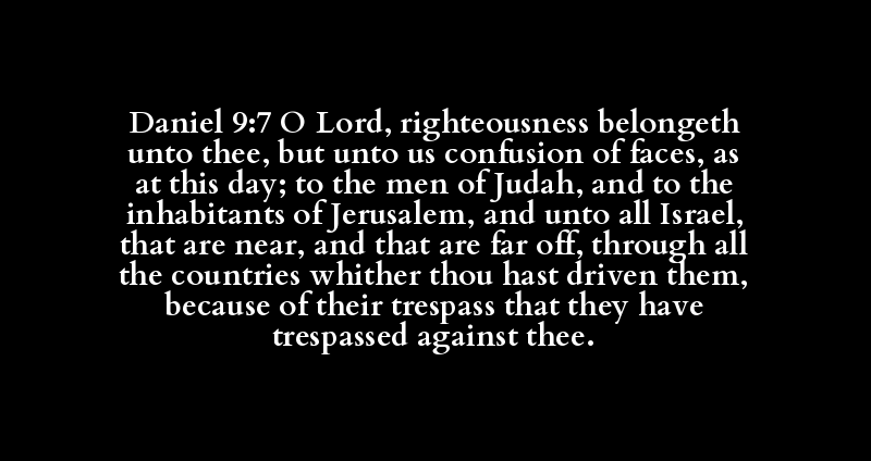 Daniel 9:7 O Lord, righteousness belongeth unto thee, but unto us confusion of faces, as at this day; to the men of Judah, and to the inhabitants of Jerusalem, and unto all Israel, that are near, and that are far off, through all the countries whither thou hast driven them, because of their trespass that they have trespassed against thee.