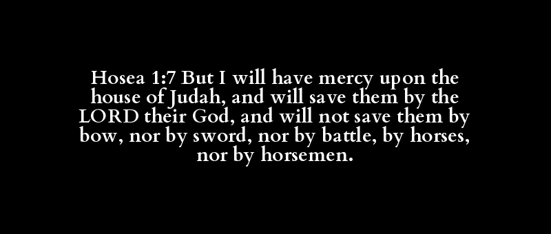 Hosea 1:7 But I will have mercy upon the house of Judah, and will save them by the LORD their God, and will not save them by bow, nor by sword, nor by battle, by horses, nor by horsemen.