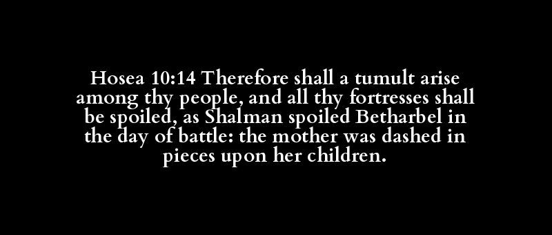Hosea 10:14 Therefore shall a tumult arise among thy people, and all thy fortresses shall be spoiled, as Shalman spoiled Betharbel in the day of battle: the mother was dashed in pieces upon her children.