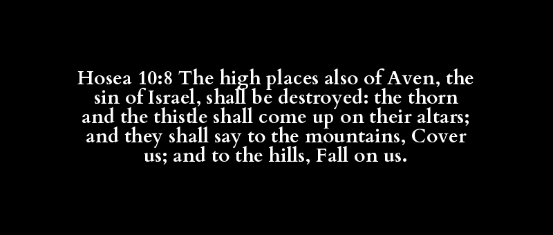 Hosea 10:8 The high places also of Aven, the sin of Israel, shall be destroyed: the thorn and the thistle shall come up on their altars; and they shall say to the mountains, Cover us; and to the hills, Fall on us.