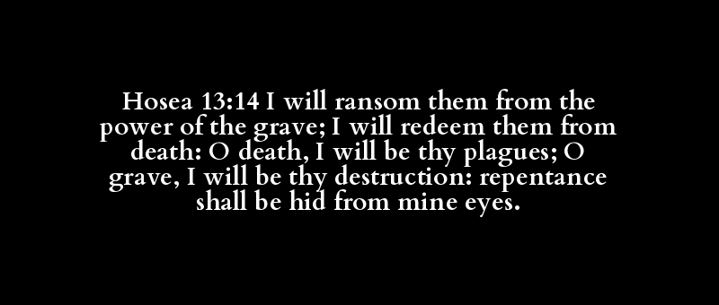 Hosea 13:14 I will ransom them from the power of the grave; I will redeem them from death: O death, I will be thy plagues; O grave, I will be thy destruction: repentance shall be hid from mine eyes.