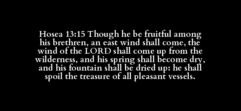 Hosea 13:15 Though he be fruitful among his brethren, an east wind shall come, the wind of the LORD shall come up from the wilderness, and his spring shall become dry, and his fountain shall be dried up: he shall spoil the treasure of all pleasant vessels.