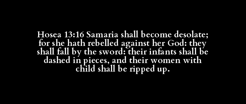 Hosea 13:16 Samaria shall become desolate; for she hath rebelled against her God: they shall fall by the sword: their infants shall be dashed in pieces, and their women with child shall be ripped up.