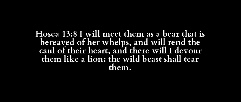 Hosea 13:8 I will meet them as a bear that is bereaved of her whelps, and will rend the caul of their heart, and there will I devour them like a lion: the wild beast shall tear them.