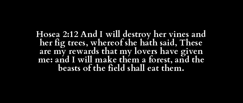 Hosea 2:12 And I will destroy her vines and her fig trees, whereof she hath said, These are my rewards that my lovers have given me: and I will make them a forest, and the beasts of the field shall eat them.
