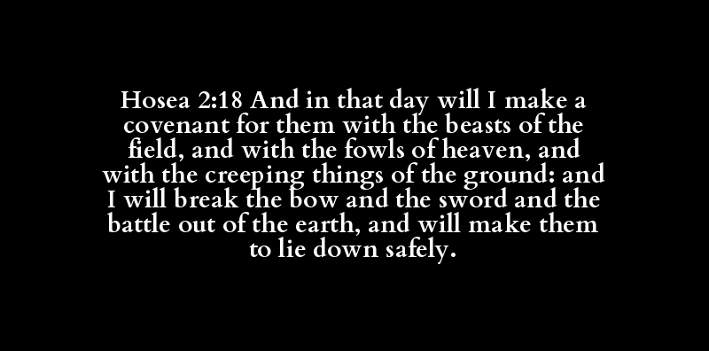Hosea 2:18 And in that day will I make a covenant for them with the beasts of the field, and with the fowls of heaven, and with the creeping things of the ground: and I will break the bow and the sword and the battle out of the earth, and will make them to lie down safely.