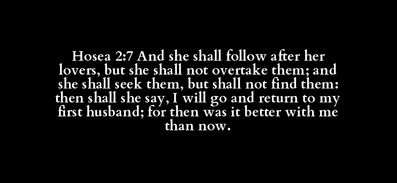 Hosea 2:7 And she shall follow after her lovers, but she shall not overtake them; and she shall seek them, but shall not find them: then shall she say, I will go and return to my first husband; for then was it better with me than now.