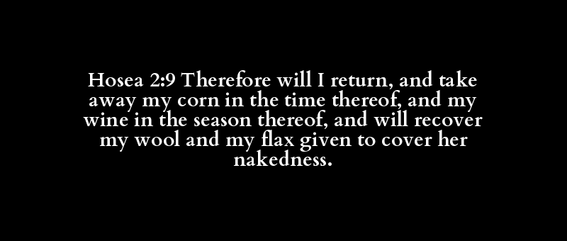 Hosea 2:9 Therefore will I return, and take away my corn in the time thereof, and my wine in the season thereof, and will recover my wool and my flax given to cover her nakedness.