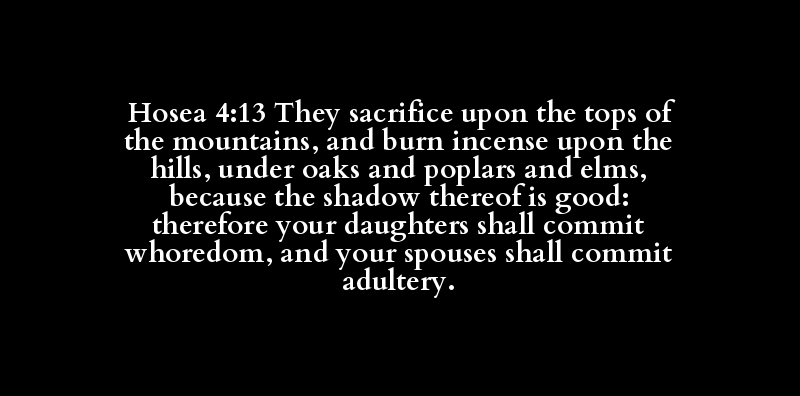 Hosea 4:13 They sacrifice upon the tops of the mountains, and burn incense upon the hills, under oaks and poplars and elms, because the shadow thereof is good: therefore your daughters shall commit whoredom, and your spouses shall commit adultery.