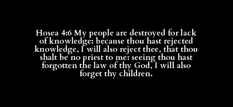 Hosea 4:6 My people are destroyed for lack of knowledge: because thou hast rejected knowledge, I will also reject thee, that thou shalt be no priest to me: seeing thou hast forgotten the law of thy God, I will also forget thy children.